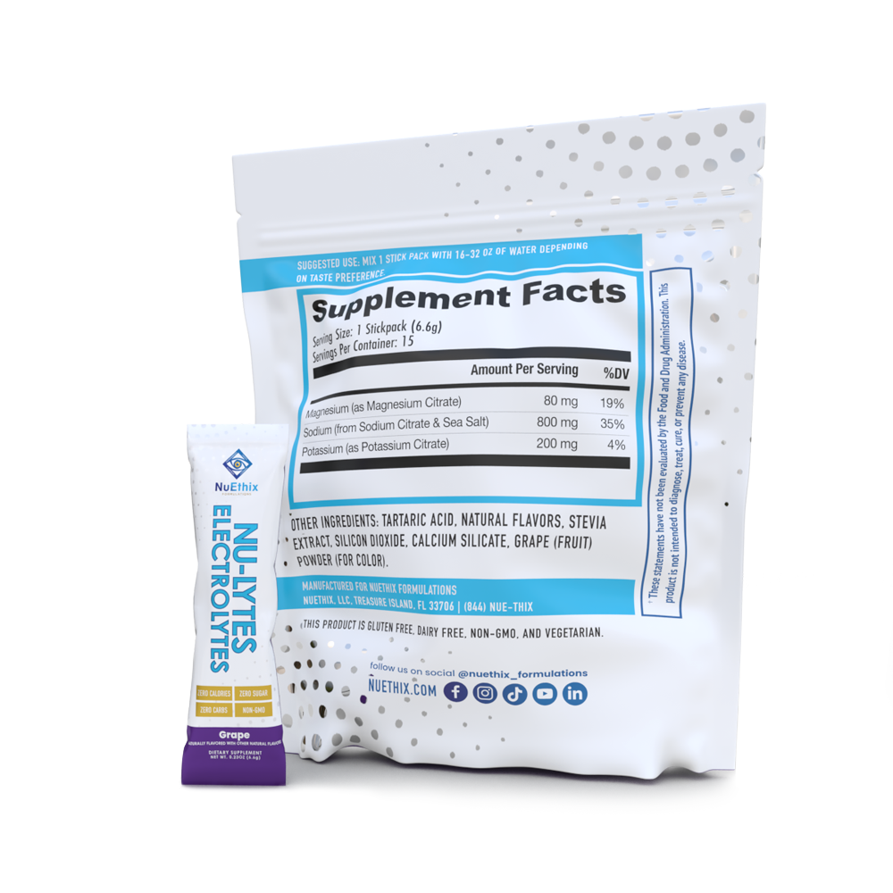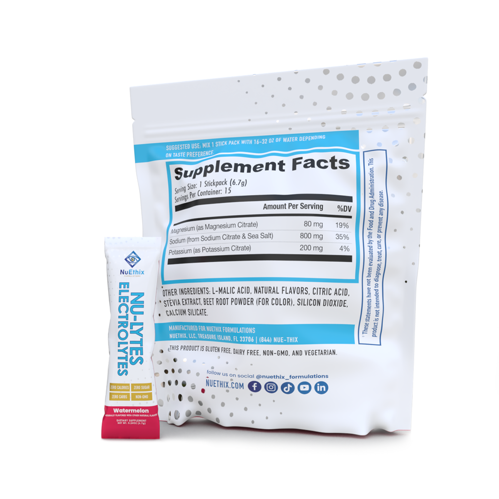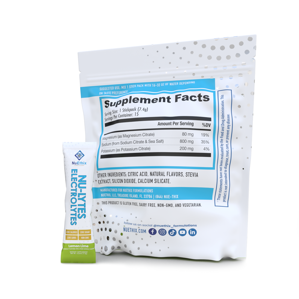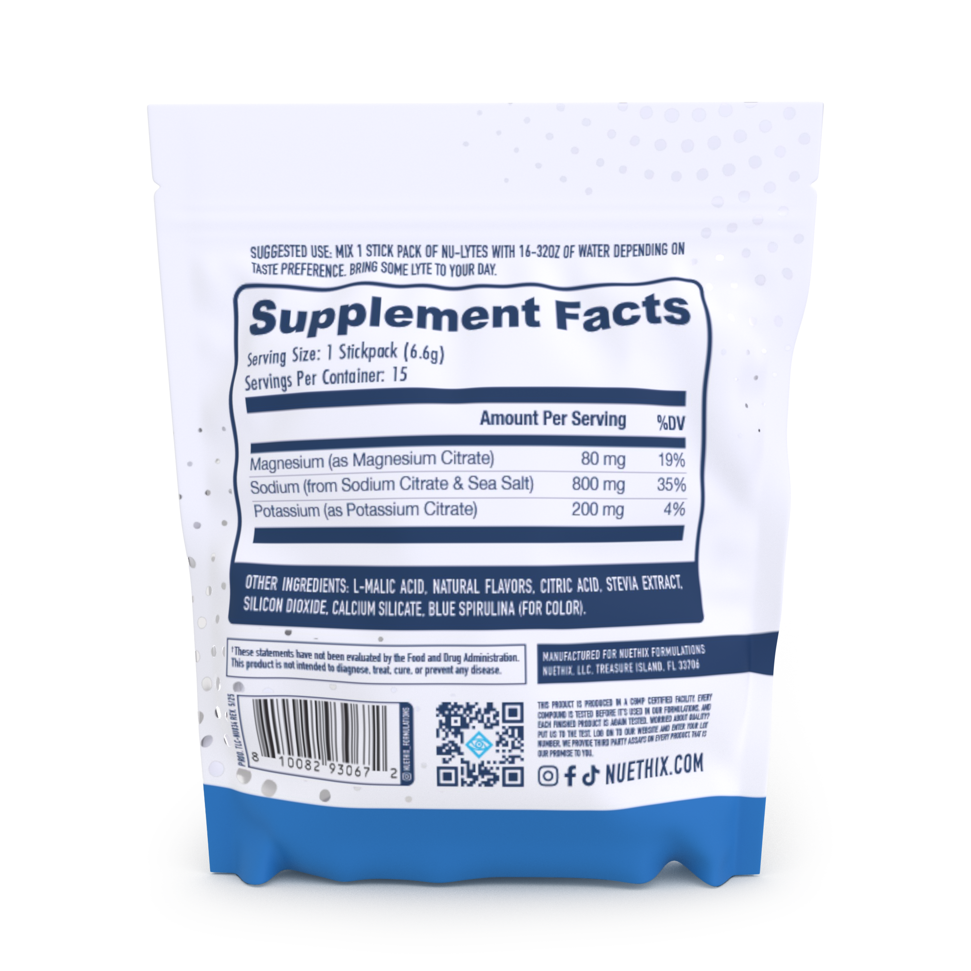 Nu-LYTES is specifically crafted to help athletes and health enthusiasts maintain their electrolyte balance, whether you're training hard at the gym, on the field, or during everyday activities. These key electrolytes play a vital role in muscle function, nerve signaling, and fluid balance. The zero-calorie, zero-sugar formula ensures that Nu-LYTES provides you with exactly what you need to stay hydrated and energized without unnecessary additives.