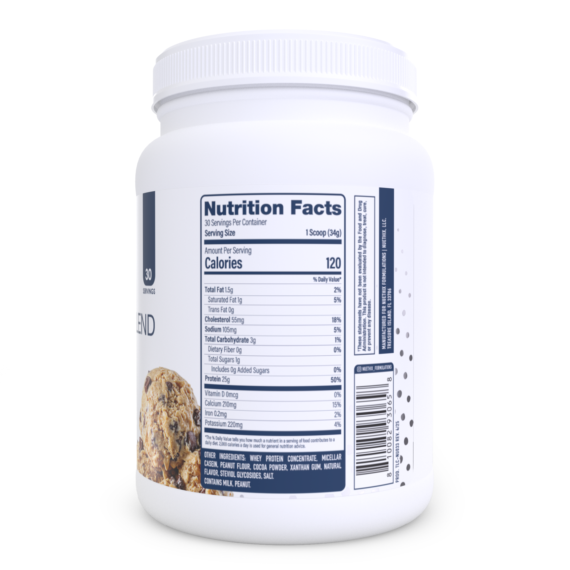 Nu-Protein Blend is a high‑quality protein powder delivering 25 g of premium protein per 34 g scoop from a dual‑source blend of fast‑absorbing whey concentrate and sustained‑release micellar casein. At just 120 calories, with 1.5 g fat, 3 g carbohydrates (including 1 g sugar and 0 g added sugars), it’s macros‑friendly for post‑workout recovery, muscle maintenance or anytime you need a clean protein boost.